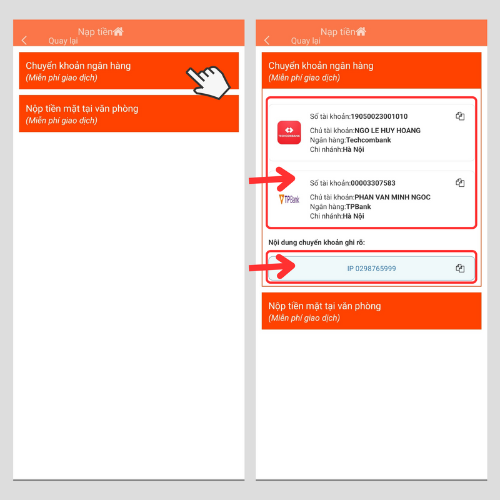 - Tiến hành chuyển khoản vào 1 trong 2 tài khoản của công ty với nội dung chuyển khoản được quy ước trên app Inpo