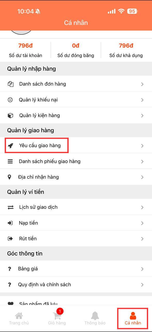 Bước 1: Tạo yêu cầu giao trước khi đến kho lấy hàng