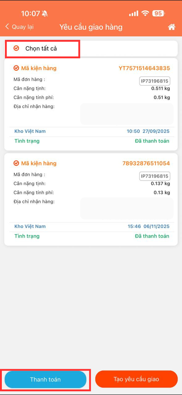 Tick chọn đúng mã kiện → bấm “Thanh toán” để hoàn tất.