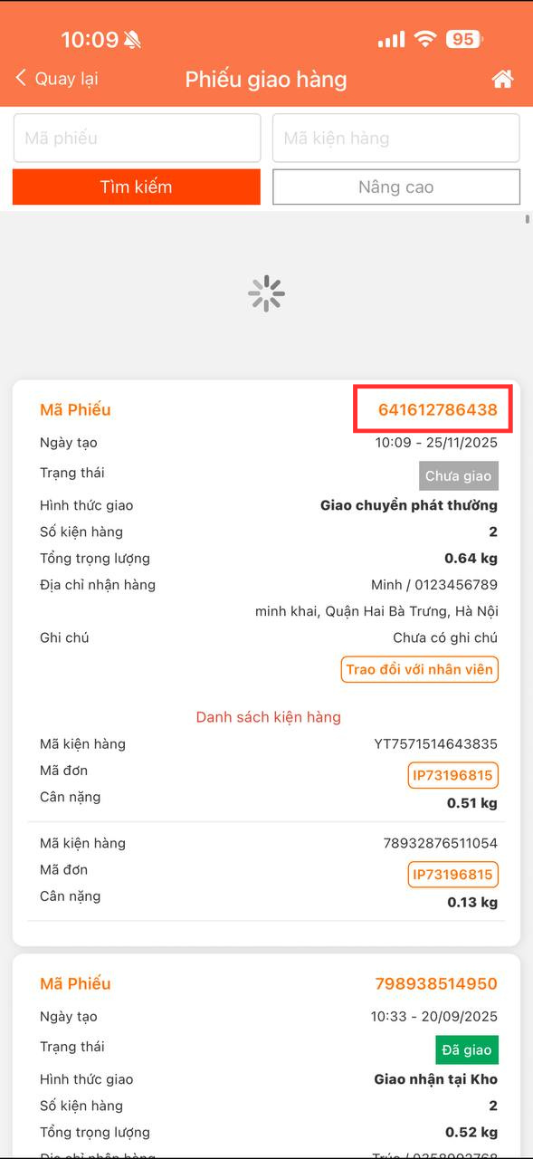 Ngay sau khi yêu cầu được tạo thành công, app sẽ hiển thị Mã phiếu giao – đây là mã cực quan trọng để kho xuất hàng cho bạn.