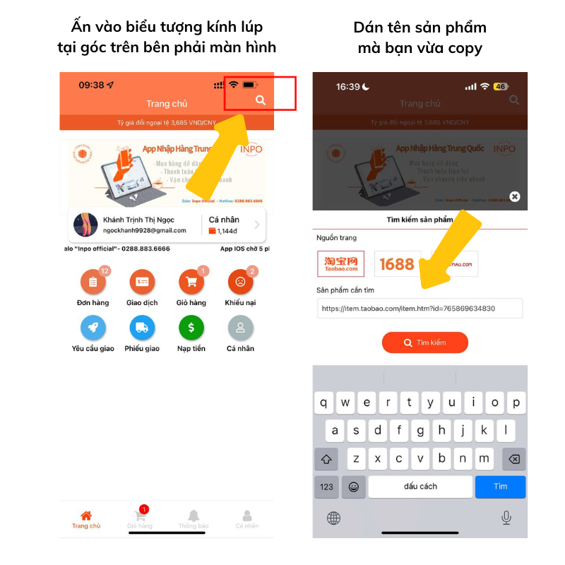 Sau khi đăng nhập bằng email hoặc số điện thoại, quý khách thực hiện các thao tác sau để đặt hàng Taobao trên app Inpo